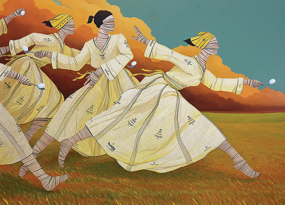 THE EGG RACE Paper sewing patterns and acrylic on canvas 48.75x68 inches
