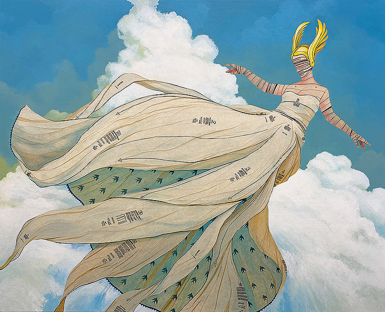 WEIGHTLESS Paper sewing patterns, cut paper, and acrylic on canvas 48x50 inches